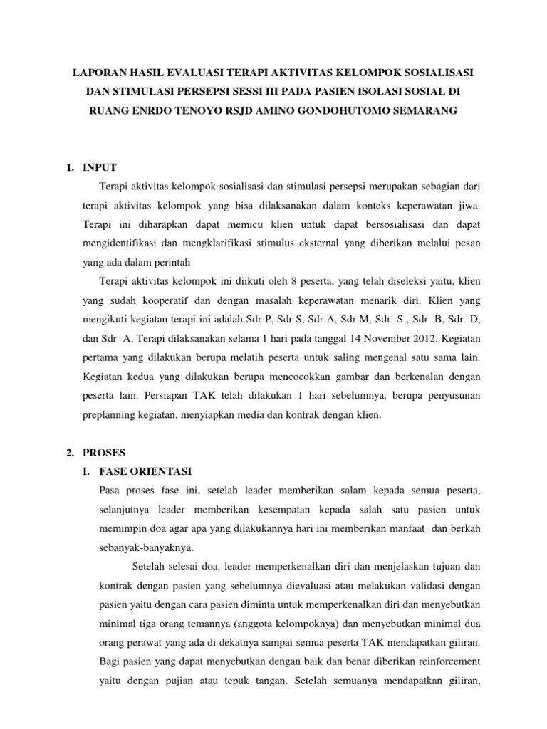 Contoh Laporan Hasil Kegiatan Terapi Aktivitas Kelompok Pada Gangguan Jiwa / Memaksimalkan Penyembuhan Pasien Gangguan Jiwa Dengan Berbagai Terapi Keperawatan Rsjd Dr Amino Gondohutomo Provinsi Jawa Tengah : Wisma dewi kunthi rumah sakit jiwa prof.. Salah satu gangguan hubungan sosial pada pasien gangguan jiwa adalah. Efektif untuk mengatasi gejala gangguan jiwa. Klien yang dirawat di rumah sakit jiwa atau ruang jiwa umumnya dengan keluhan tidak dapat diatur di rumah, misalnya amuk, diam saja, . Membuat laporan hasil kegiatan 4. Terhadap kemampuan mengontrol halusinasi di rs.